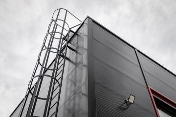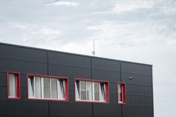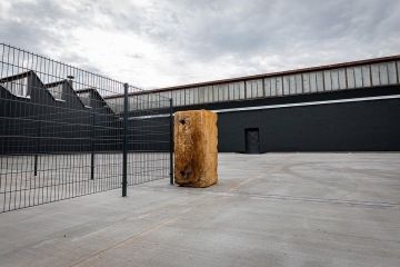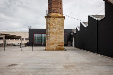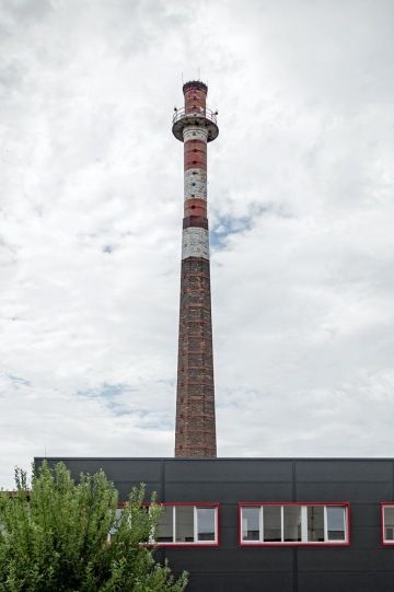 Modernímu areálu vévodí historický komín.