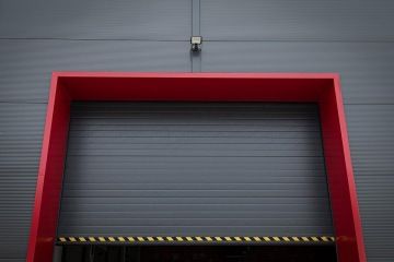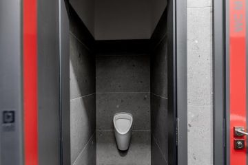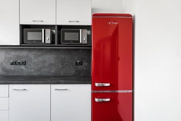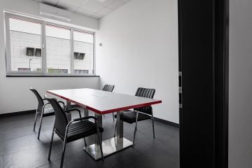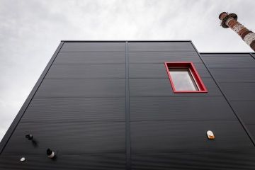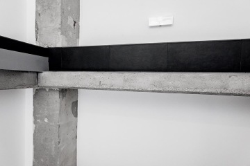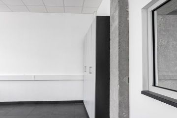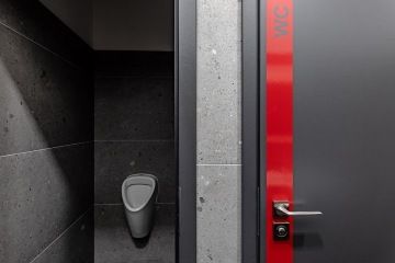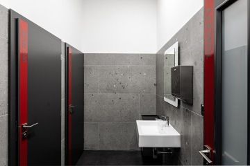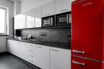 Jednolitý minimalistický interiér oživuje kontrastní červená barva, a to jak v podobě vybavení, tak například obkladových lišt.